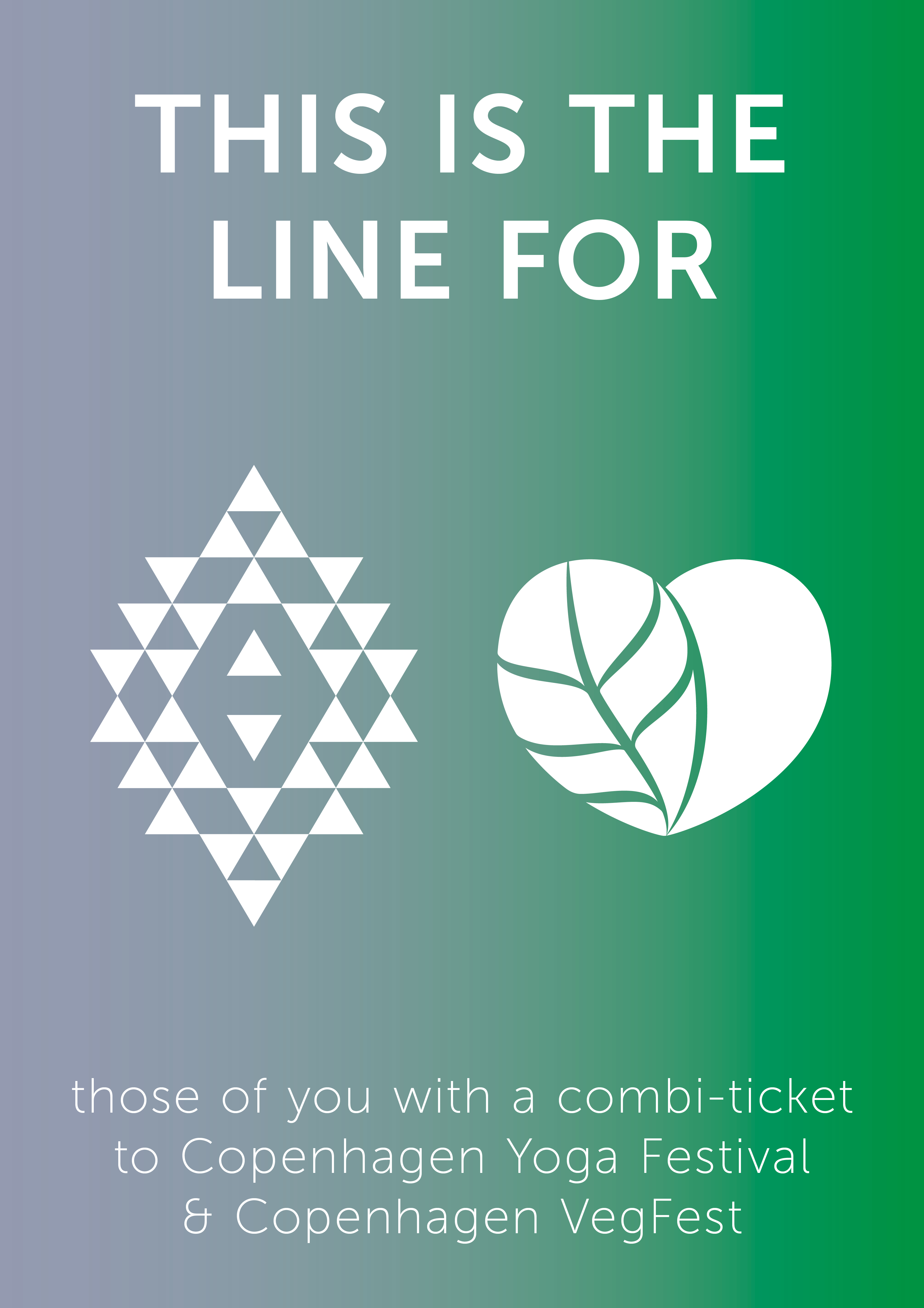 Der vil i år være tre køer – én til yogafestivalbilletter, én til VegFest billetter og én til kombi-billetter. Se nedenfor hvilket skilt du skal gå efter.